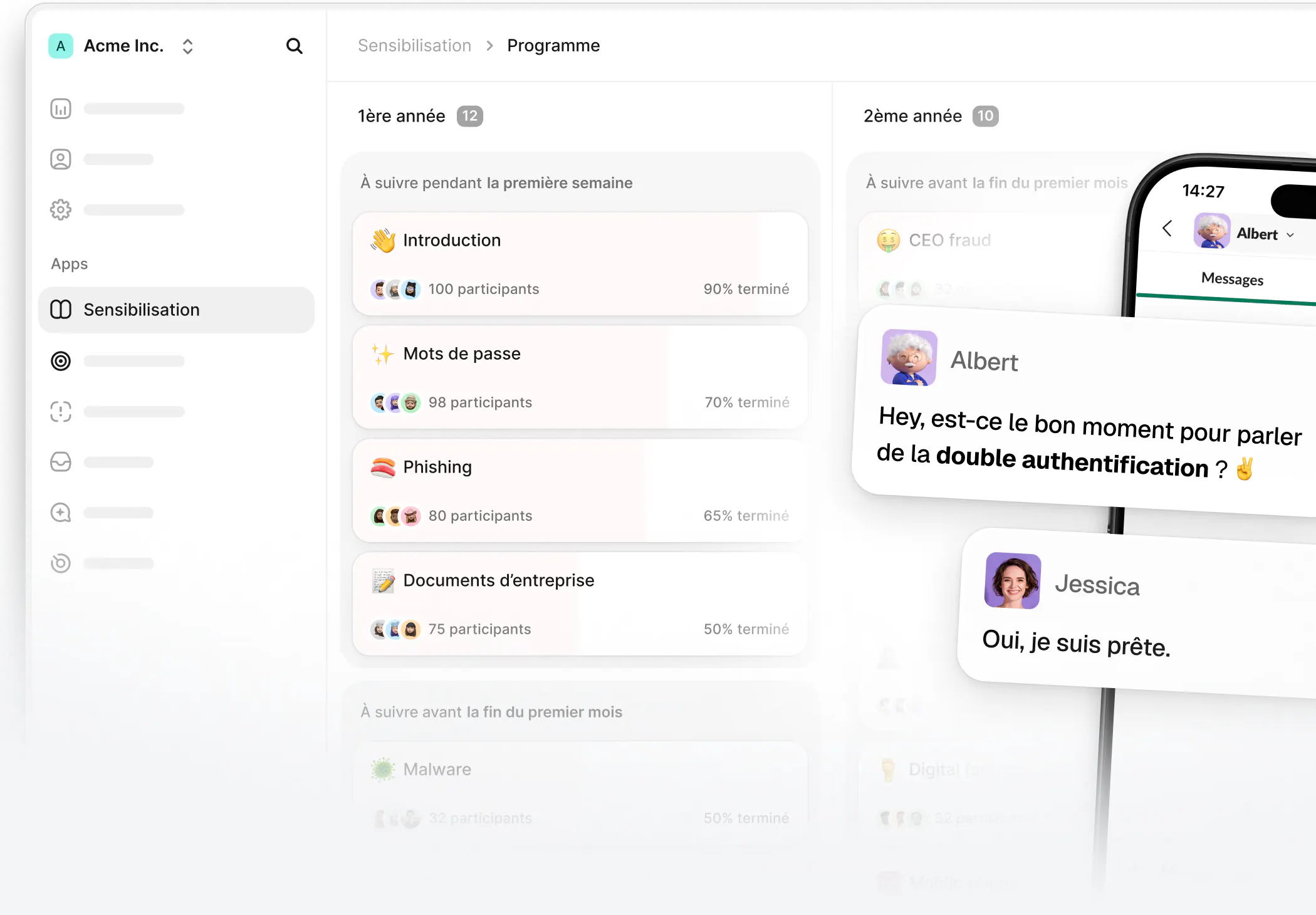 Réel impact : La sensibilisation d'Albert ne se limite pas à la culture - elle améliore la posture cyber de vos équipes et les forme sur les sujets cyber d'actualité.